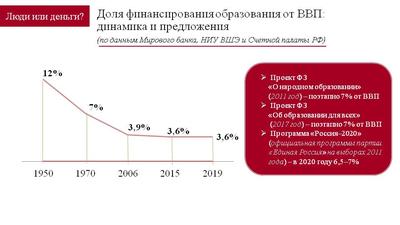 Очевидно: программные установки партии власти и ведущей партии оппозиции в части финансирования образования совпадают – около 7% от ВВП. Однако мы не заимствовали ключевые показатели программы партии «Единая Россия» в наших законопроектах, точно так же, как «Единая Россия» не заимствовала показатели своей программы у нас. Видимо, те и другие послушали высококвалифицированных экспертов. А они доказывают: ни одна страна не обеспечила себе экономического прорыва при меньших затратах на образование.
