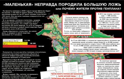 В листовке убедительно раскрыты многочисленные недостатки, низкий уровень документа, предназначенного служить программой развития города. Например, за 17 лет (2013-2030) численность трудового населения при заявленной застройке города возрастет на 30 тысяч человек, а рабочих мест планируется создать только 7000. Только каждый третий житель Щелково сможет найти работу в городе. При этом предусматривается сократить на 200 га площадь производственных зон.