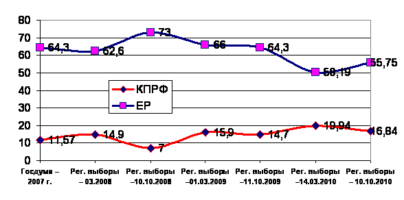 У КПРФ за год, по сравнению с октябрьскими выборами 2009 года уровень поддержки вырос в абсолютном выражении на 2,14%. В относительном выражении партия получила дополнительную поддержку на 15%. Хотя по сравнению с мартовскими выборами 2010 у КПРФ некоторое снижение. Но в целом, за последние два года отмечается позитивный рост поддержки КПРФ на региональных выборах с 7% в октябре 2008, до 17% в октябре 2010.