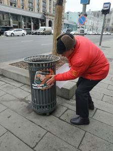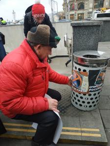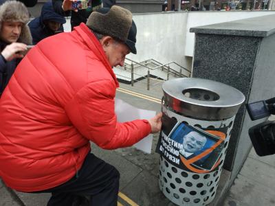 Участники акции наклеили на урны и мусорные баки в центре Москвы наклейки с фотографиями Соловьёва, Киселёва и Караулова. «Там им самое место», — сказал Рашкин.