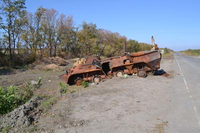 Едим на выезд из города, района Металлиста, туда, откуда наемные батальоны Коломойского обстреливали город, туда, где шли ожесточенный бои при взятии ополченцами этого пункта, туда, где погибли наши журналисты — Игорь Корнелюк и Антон Волошин. При подъезде открывается страшная картина — дорога изуродована и искорежена, огромное количество воткнутых в землю снарядов, вся земля усыпана пустыми гильзами. Здесь также пост. На посту ополченцы, опять же, вежливые люди, проходим дальше — везде сожженые танки, машины, личные вещи наемников. Разворачиваясь в сторону города, видим его как на ладони, удобная позиция, нечего сказать. По над дорогой разгромленный лагерь, впереди видим машины комендатуры — убирают мины, снаряды, их, к слову, огромное множество. По окончанию бывших укреплений наемников, разбитый пост, сейчас представляет собой груду металла, осколков, снарядов, воткнутая искореженная табличка «Луганск» и огромный красный флаг с серпом и молотом.