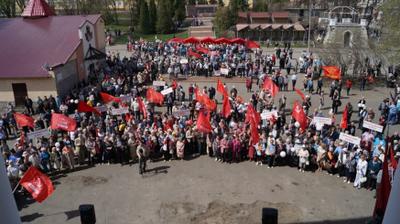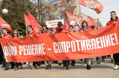В 10.40 колонны выстроилисьи началось движение. Впереди – оркестр, за ним первый секретарь Лунинского райкома КПРФ Олег Селезнёв с огромным красным флагом, на котором изображён наш вождь и учитель Владимир Ильич Ленин. Затем комсомольцы с длинным транспарантом «Одно решение – сопротивление!». Сразу за транспарантом идут лидеры областного отделения КПРФ – секретари обкома Георгий Камнев, Владимир Симагин, Олег Шаляпин. За ними колонны из сотен людей. Кажется, что они никогда не кончатся. Смотришь через объектив фотокамеры и не видишь «хвоста» этих колонн. В разношёрстных первомайских колоннах КПРФ встретились даже участники митингов «Единой России» и ЛДПР, которые пожелали идти с коммунистами.