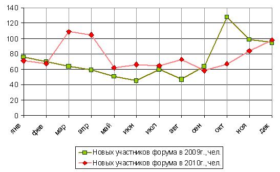 За исследуемый годовой период на форуме вновь зарегистрировалось и начали принимать участие в дискуссиях 926 человек. Это значит, к активной работе на форуме ежемесячно подключается в среднем 77 человек (график 2).