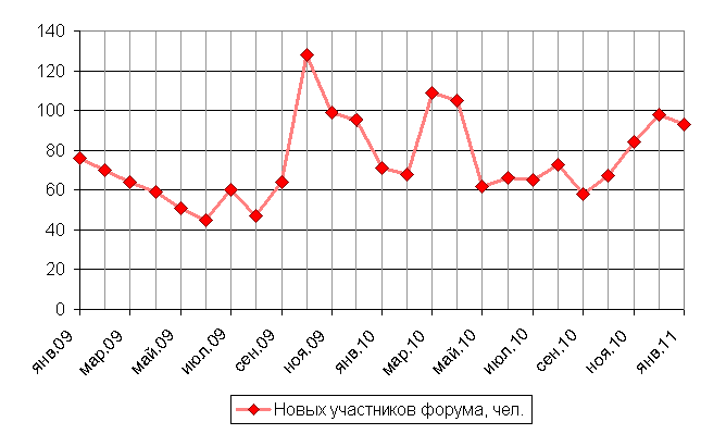 На протяжении прошедшего месяца форум посещало в среднем 1290 человек в день (график 1). После традиционного летнего затишья, с августа 2010 года наблюдается устойчивый рост посещаемости форума. Хотя подобная динамика и отвечает традиционным сезонным флуктуациям, но показатели последних двух месяцев прошлого года превышали соответствующие значения 2009 г. Январь 2011 года также не стал исключением в этой благоприятной для форума тенденции.