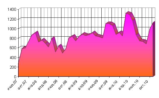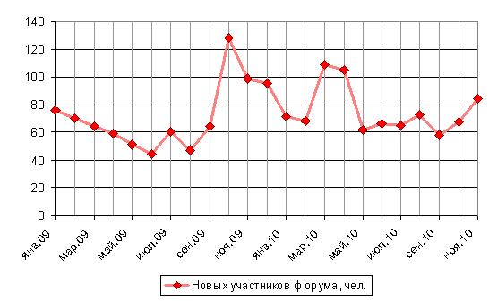 На протяжении прошедшего месяца форум посещало в среднем 1125 человек в день (график 1). За последние два месяца наблюдается устойчивый рост посещаемости форума – более чем в полтора раза по сравнению с летним периодом. Хотя подобная динамика и отвечает традиционным сезонным флуктуациям, но ноябрьский показатель 2010 года превышает соответствующее значение ноября 2009 г.