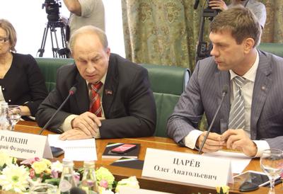 На фото: после переговоров в Минске ("РИА "Новости") и спикер парламента Ноаороссии Олег Царев и зампред ЦК КПРФ Валерий Рашкин на совещании в Совете Федерации РФ