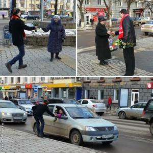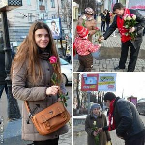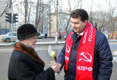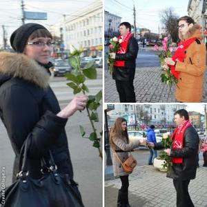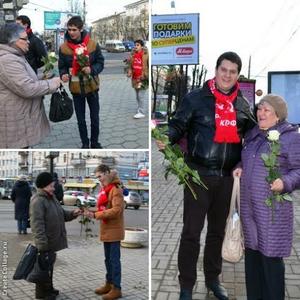 Олег Лебедев и молодые коммунисты на улицах Тулы в канун праздника дарили женщинам цветы