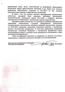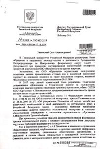 Проверкой генеральной прокуратуры также установлено, что несмотря на указанные нарушения при проведении общественных слушаний, департамент Росприроднадзора по ЦФО все-таки пошел на проведение «государственной экологической экспертизы» указанной документации, и приказом от 05.10.2018 г. утвердил заключение «экспертной комиссии» о соответствии проекта экологическим требованиям. В этой связи Генеральная прокуратура РФ в ЦФО рассматривает вопрос о внесении актов прокурорского реагирования в адрес руководителя департамента.