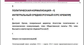 Доклад состоит из нескольких частей. Первая называется «Запрос на нормализацию». В ней излагается, что «нормализация, [политической жизни – Т. К.] опирающаяся на большинство населения, а также на ответственный бизнес и сторонников постепенных структурных и социальных реформ, постепенно стала системным интегральным курсом Кремля».