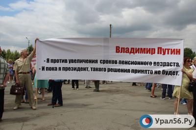 Несмотря на жару, у ДК «Железнодорожник» собралось около 1,5 тысяч горожан. Они пришли с плакатами и транспарантами, показывающими отрицательную позицию в отношении планируемой реформы: «Реформаторы, ищите деньги в своих карманах», «Медведева и его правительство в отставку», «Нам не дожить до новой пенсии» и другие. Предполагалось, что активисты выступят против повышения пенсионного возраста и за отставку правительства Дмитрия Медведева. Но в ходе митинга орчане выступили с предложением отправить в отставку и действующего президента Владимира Путина, объясняя это тем, что 27 сентября 2005 года на «прямой линии» глава государства заявил: «Пока я президент, увеличения пенсионного возраста не будет. Я против увеличения сроков пенсионного возраста».