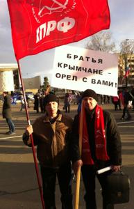 Коммунисты и общественники (ЛКСМ, РУСО, Дети войны, Русский лад, Надежда России) приняли активное участие в мероприятии. В их руках были алые флаги и плакаты с лознгами: «Братья крымчане – Орел с Вами!», «Майдановских боевиков к ответу!», «За будущее Крыма вместе с Россией!».