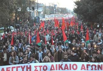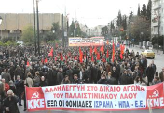 Вчера, 4 января, в Афинах прошла демонстрация солидарности с Палестинским народом, организованная КПГ. Несмотря на то, что она была объявлена лишь день до того, манифестация была на редкость массовой.