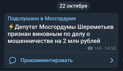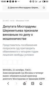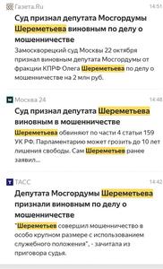 Замоскворецкий районный суд г. Москвы признал виновным депутата Московской городской Думы от КПРФ О.М. Шереметьева в мошенничестве в особо крупном размере. Он приговорён к четырём годам условного отбытия наказания. Ему же будет запрещено в течение последующих двух лет занимать должности на государственной службе. Одновременно суд постановил взыскать с Олега Шереметьева 2 171 000 рублей в пользу Московской городской Думы. Арест его имущества сохраняется до выплаты штрафа.