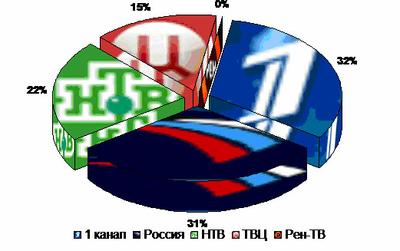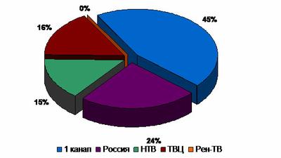 Максимальная эта величина для «Первого» канала 45%. Далее следует канал «Россия» (24%), ТВЦ (16%) и НТВ (15%).