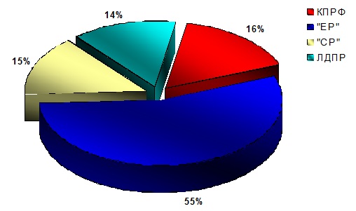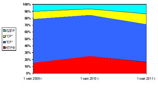 Обратная ситуация наблюдается в случае с «Единой Россией». Доля Партии власти неуклонно падает. В 2009 году она составляла – 64%, в 2010 – 59%, а в 2011 – уже 55%.
