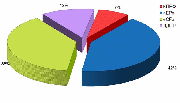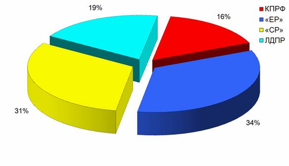 «Единой России» было предоставлено 34% телеэфира, «СР» 31%, ЛДПР 19%. КПРФ предоставили 16% (или 6 мин 24 сек), что в два раза меньше, чем «Единой России». (График 1)