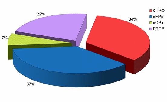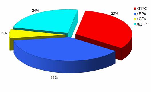 «Единой России» было предоставлено 36% телеэфира, «СР» 6%, ЛДПР 24%. КПРФ телеканалы предоставили 31% (или 4 мин 44 сек), что на 48 сек меньше, чем «Единой России». (График 1)