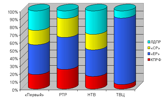 «Единой России» была предоставлена наибольшая доля телеэфира на ТВЦ (84%). Однако нигде эта величина не опускалась ниже 43%. «Справедливая Россия» заняла максимум эфира телеканалов «Россия» и НТВ (по 20%). ЛДПР отдали предпочтение «Первый» канал (14%).