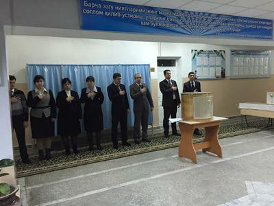 Перед открытием избирательного участка, члены избирательной комиссии и наблюдатели от политических партий, доверенные лица кандидатов в депутаты (граждане Республики Узбекистан), стоя прослушали Гимн Республики Узбекистан.