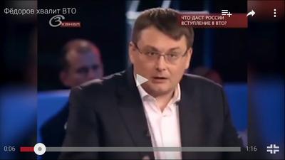 Сколько инновационных предприятий уже построено за 3 года догадается каждый, но речь о другом. Среди прочих документов по ВТО существует Меморандум ВТО от 19 марта 2001 года, который даёт право суду ВТО ПЕРЕСМАТРИВАТЬ И ОТМЕНЯТЬ ВНУТРЕННИЕ ЗАКОНЫ РОССИЙСКОЙ ФЕДЕРАЦИИ (члена ВТО), а КОМИССИЯ ВТО ИМЕЕТ ПРАВО НА ВЕТО РЕШЕНИЯ ПАРЛАМЕНТА РФ . Так у депутата Фёдорова расходятся слова с делами. И мы решили спросить: а почему так? В обилии речевых оборотов и эпитетов получилось выделить хоть какие-то связанные мысли: