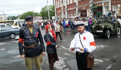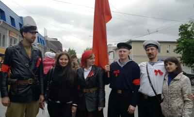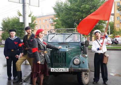 Переодетые в форму комиссаров и матросов периода Октябрьской революции, на ретроавтомобиле ГАС-69 с открытым «верхом» и прикрепленным, развевающимся по ветру красным флагом, четверо молодых людей курсировали по улицам города, по маршруту движения посетив несколько музеев: «Город», «Мир времени», краеведческий и ряд других. Поздравляли горожан с праздником и зачитывали Декрет Совнаркома РСФСР 1918 года. Данным документом Советская власть запрещала вывоз за границу предметов искусства и старины.