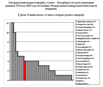 Представим официальные данные за 2007 год, предоставленную ФКК «Россвязьнадзор». Как следует из результатов официальной статистики в 2007 году (когда наша радиостанция победила в конкурсе за право вещания) радиогазета «Слово» занимала в Санкт-Петербурге седьмое место по количеству слушателей, опережая ряд известнейших радиостанций различного жанра (Источник: TNS, конкурсная комиссия, сентябрь 2007 г.).Отсюда следует, что«Слово» имеет аудиторию, приблизительно равную 300 000 человек.