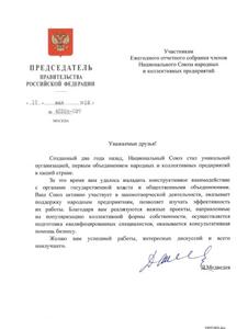 Как сообщил депутат Государственной Думы, Президент Национального Союза Народных и Коллективных Предприятий Павел Дорохин, в адрес Союза поступило приветственное письмо от премьер-министра России Дмитрия Медведева. Ранее глава кабинета уже проявлял предметный интерес к развитию в нашей стране кооперативного сектора. Письмо было оглашено на ежегодном отчетном собрании членов НСНКП.
