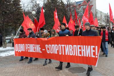 Впереди – военный оркестр, играющий советские песни. Затем колонны комсомольцев с растяжкой «Одно решение – сопротивление», коммунисты во главе с руководством областного и городского комитетов КПРФ. К акции также присоединились активисты организации «Дети войны» и представители других общественных объединений.