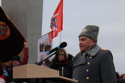 Первый секретарь обкома КПРФ Георгий Камнев поздравил со сцены всех присутствующих со 100-летим Великой Октябрьской социалистической революции.
