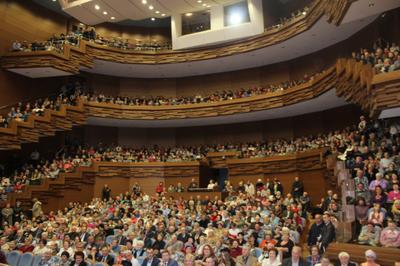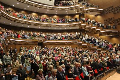 Праздничный концерт, посвящённый 100-летию Великого Октября, завершился исполнением песни «И вновь продолжается бой», которую стоя подпевал весь зал областной филармонии.