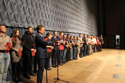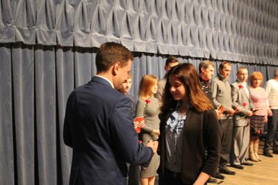 Во время торжественного концерта секретари обкома КПРФ Георгий Камнев и Дмитрий Филяев вручили памятные медали, утвержденные ЦК КПРФ «100 лет – Октябрьской революции», а также партийные и комсомольские билеты.