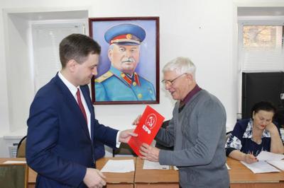 Первый секретарь Лунинского райкома КПРФ Олег Селезнёв в свою очередь вручил Георгию Камневу в подарок портрет В.И. Ленина.