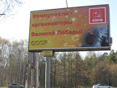 Большие щиты, на которых красные буквы словно зарождаются в искрах победного салюта, развевается красное советское знамя над поверженным рейхстагом, и словно подпись – эмблема КПРФ, расположены на оживлённых магистралях города. Один из таких щитов встречает каждого, кто прибывает в город, прямо у вокзала Пермь-II - железнодорожных ворот столицы Прикамья.