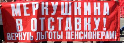 При прохождении колонны КПРФпо пл. Куйбышевамимо центральной трибуны с губернатором и руководством области и города в руках у демонстрантов появился большой транспарант "Меркушкина в отставку! Вернуть льготы пенсионерам!