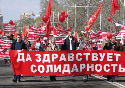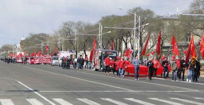 По традиции колонна с транспарантами, флагами и лозунгами выстроилась утром на площади Победы. В ряды коммунистов в этот раз встали активисты «Левого фронта» и предприниматели Центрального рынка, которых выживают со старого места работы представители власти и крупного капитала.