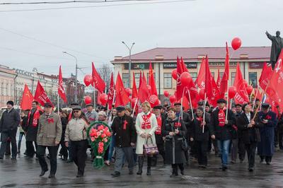 Под музыку советских лет в сопровождении автомобиля, оформленного символикой КПРФ, колонна демонстрантов прошла по центральной улице города до Новособорной площади. Там состоялся митинг.