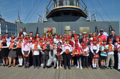 Пионерская линейка на крейсере революции: Делу Ленина верны!