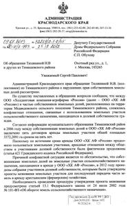 На имя депутата Госдумы фракции КПРФ С.П. Обухова пришел ответ на его депутатский запрос от первого заместителя главы администрации (губернатора) Краснодарского края Д.Х. Хатуова. Представитель краевой Администрации отчитался перед депутатом-коммунистом о результатах рассмотрения вопроса о нарушении прав собственников земельных долей в Тимашевском районе. Приводим в полном объеме текст письма.