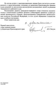 район А.В.Житлов совместно с заместителем начальника управления по взаимодействию с общественными объединениями и религиозными организациями департамента внутренней политики администрации края В.В.Острожным посетили представителя жителей станицы Медведовской Тимашевского района, объявивших голодовку, Валентову Валентину Леонидовну, а также провели встречи с главой крестьянского (фермерского) хозяйства Онищенко В.И. и руководством ОАО "ХК АФ «Россия» (Басалко И.Б., Мирошник В.И). В ходе состоявшихся встреч было разъяснено, что изменение принятого или вступившего в законную силу решения суда первой инстанции возможно только в судебном порядке.