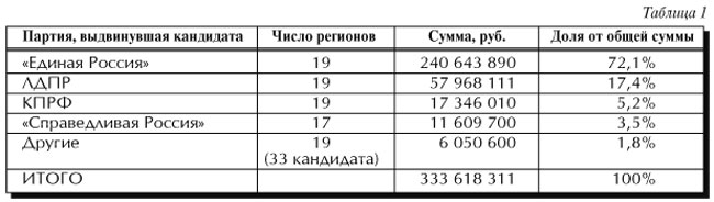В избирательных фондах кандидатов в губернаторы накоплено в общей сложности 333,6 млн рублей. Партийный расклад получился следующий (см. таблицу 1).