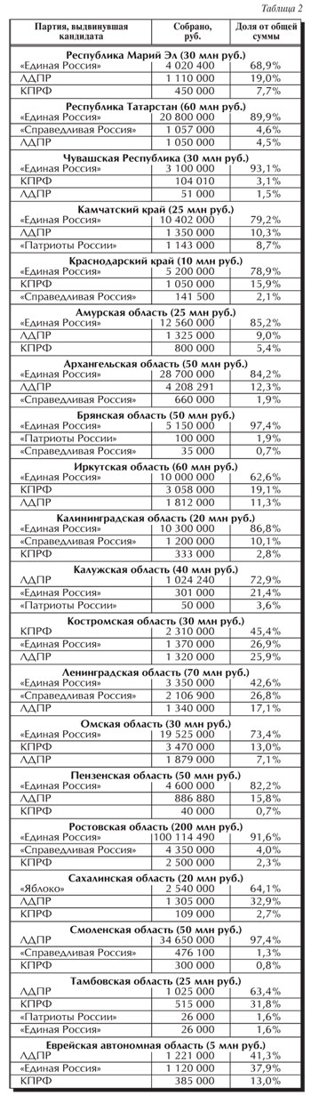 Таким образом, налицо полное финансовое доминирование «Единой России». Если учесть, что в Смоленской области баллотирующийся на следующий срок губернатор является членом ЛДПР (размер фонда 34,7 млн руб.), то преобладание партии власти становится еще более весомым – 82,5%. Очевидно, партия власти рассчитывает получить сопоставимый процент голосов избирателей.Для любителей более детального анализа приводим также региональные тройки лидеров по размерам накопленных в избирательные фонды денег (см. таблицу 2). В скобках после наименования субъекта Федерации указан предельно допустимый размер избирательного фонда одного кандидата.