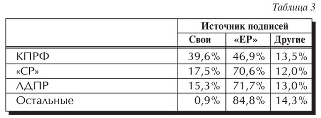 То, что «Единая Россия» лидирует не во всех регионах, объясняется, очевидно, незавершенностью формирования избирательных фондов, и этот «недостаток» будет наверняка исправлен ближе к выборам. Помимо финансового ресурса, партия власти располагает мощным административно-политическим ресурсом. Речь идет о так называемом муниципальном фильтре. Для регистрации каждый кандидат в губернаторы должен собрать в свою поддержку от 5 до 10 процентов подписей от общего числа муниципальных депутатов и избранных на выборах глав муниципальных образований данного региона. При этом депутат или глава может отдать свою подпись только одному кандидату. И уже выяснилось, что кроме «Единой России» ни одна политическая партия не может собрать необходимое число только «своих» подписей. Поэтому всем приходится идти на поклон к другим партиям, и в первую очередь к «Единой России». Это означает, что право отбора кандидатов принадлежит партии власти, то есть фактически региональной администрации. А уж она-то обязательно постарается отсеять неудобных ей кандидатов. И наоборот, поддержать кандидатов от партий-спойлеров, среди которых на нынешних выборах фигурируют такие экзотические экземпляры, как Коммунистическая партия социальной справедливости (КПСС) и Казачья партия Российской Федерации (КПРФ). Ситуация крайне неприятная для оппозиции. Но ничего не поделаешь – чтобы ее исправить, всем необходимо многократно усилить работу на муниципальном уровне.В недавно опубликованном докладе «Комитета гражданских инициатив» по долгосрочному наблюдению выборов содержатся некоторые (неполные) данные на этот счет, позволяющие судить о степени зависимости от партии власти (см. таблицу 3).