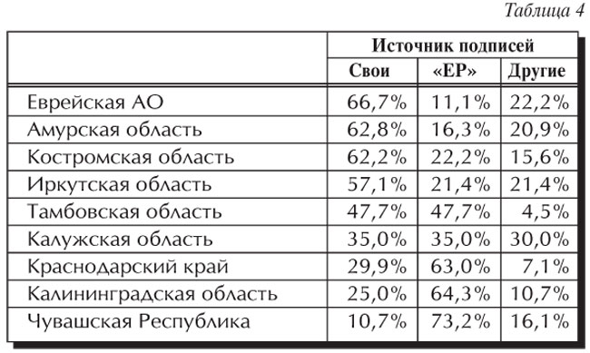 Таким образом, зависимость КПРФ наименьшая среди всех партий, но все же очень существенная. Детальные региональные данные по кандидатам, выдвинутым КПРФ, таковы (см. таблицу 4).