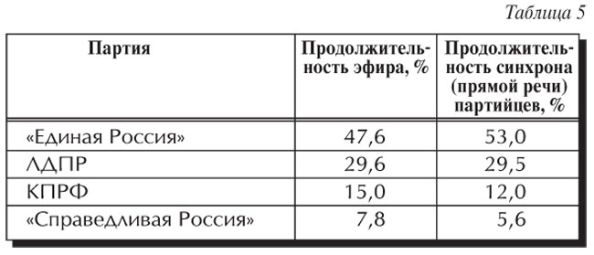 Наконец, об информационно-пропагандистском ресурсе. По данным Отдела ЦК КПРФ по аналитической работе и проведению выборных кампаний, в июле на пяти федеральных телеканалах парламентским партиям было предоставлено 7 часов 49 минут эфирного времени. При этом структура суммарного партийного эфира выглядит следующим образом (см. таблицу 5).