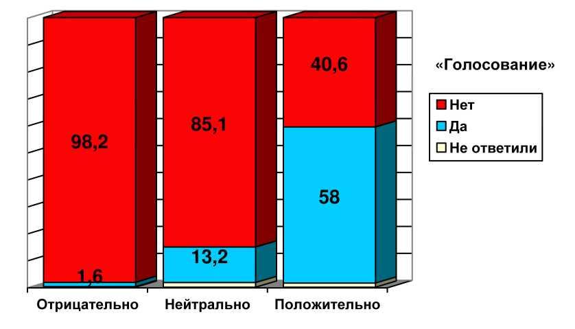 Таким образом, «правильной и полезной» программу считает только 10% населения, еще 20% относится к ней безразлично, а 70% - относятся явно отрицательно. Но это неудивительно - именно потому, что программу считают вредной и неправильной, люди и «голосуют» против ее проведения в стране. Удивительно другое: даже среди тех, кто относится к программе «положительно», то есть считает ее правильной, 40% (sic!) «голосуют» против ее проведения в нашей стране - см. рис. ниже.