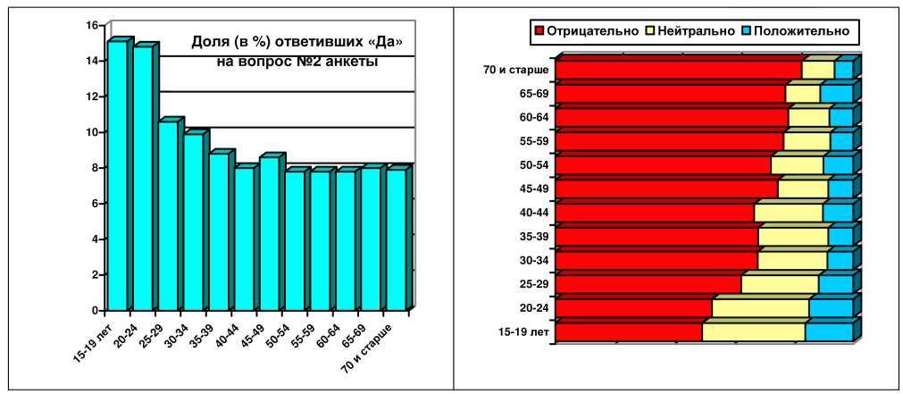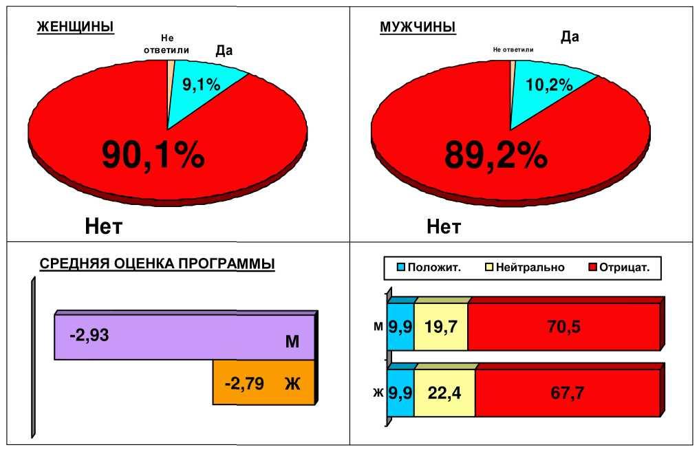 Легко видеть, например, что различий между мнением женщин и мужчин (см. рисунок выше) практически нет. Разве что мужчины чуть более резко и определенно высказываются относительно программы, но не настолько, чтобы можно было бы говорить о каких-то серьезных различиях.