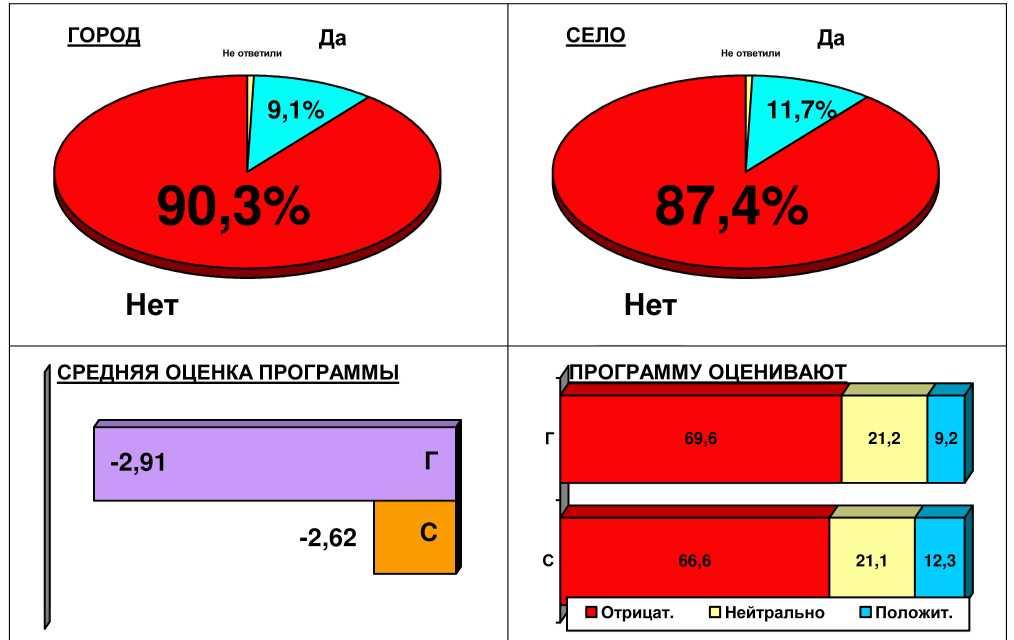 Таким образом, почти 90% населения России считает, что подобную программу осуществлять не нужно. И если Президент все-таки начнет ее осуществлять, несмотря на мнение народа (а история знает такие примеры), то он просто плюнет в лицо 90% граждан России, которые по совместительству в настоящий момент являются избирателями этого самого (ну, или другого такого же) Президента.