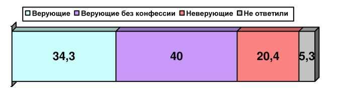 Здесь необходимо пояснить, что представляет собой группа «Верующие без конфессии». Это люди, которые называют себя верующими, но никакой своей религиозно-конфессиональной принадлежности указать не могут. Кроме того, в эту группу включены люди написавшие в качестве «конфессии» что-то вроде: верю «в любовь», «в силу науки», «в силу растущего колоса», «в истину», «в правду», «в рациональность» и пр. Есть все основания считать, что эта группа - наиболее подвержена (по сравнению с другими - с верующими и неверующими), так сказать, внешним воздействиям -пропаганде, психологическому давлению, моде и пр. Именно в силу влияния этих внешних воздействий люди, входящие в эту группу, не могут признать себя неверующими (это сейчас немодно и даже как-то нехорошо - быть неверующим) и считают себя верующими, но вот во что они верят - это для них самих загадка.
