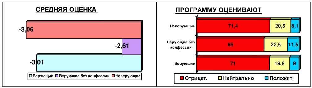 Нетрудно увидеть, что лучше всего к программе десталинизации относятся как раз люди, которые входят в группе «Верующие без конфессии». И есть что-то исключительно зловещее в том, что именно умы «ни в чем не твердые», подверженные влиянию, и в данному случае более других поддаются психологическому давлению, ближе всех к одобрению программы десоветизации. Однако «караул!» кричать еще явно рано: при всем при том все равно подавляющее большинство «верующих без конфессии» оценивают десталинизацию негативно и проведения ее не жаждет. Соответственно, желающим осуществлять десталинизацию придется еще работать и работать - даже с этой «легкой» категорией, а что уж говорить о «твердолобых» верующих и атеистах, которые в одном строю выступают против десоветизаторских начинаний Совета по правам человека.