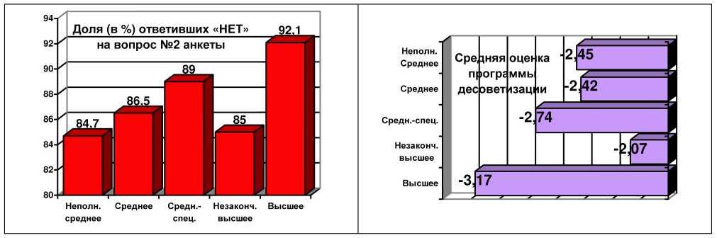 Из рисунков хорошо видно, что чем старше люди (то есть чем более длительный срок они подвергались «государственному терроризму» со стороны преступного Советского государства), тем меньше они склонны поддерживать программу десоветизации. И наоборот, чем моложе граждане (то есть чем меньше у них было шансов испытать преступления СССР на собственной шкуре), тем больше они готовы согласиться, что программа десталинизации нужна. Абсолютным рекордсменом тут является группа «15-19 лет», то есть состоящая из родившихся после развала Советского Союза - именно среди них максимальна доля тех, кто считает, что программу десталинизации надо проводить (таких 15,1%) и тех, кто относится к этой программе весьма положительно (таких 16,1%). Но и эту группу «невинных младенцев» совершенно никак не назовешь (будучи в трезвом уме и твердой памяти) «сторонниками» десоветизации. Потому что и в этой группе против проведения программы высказывается подавляющее большинство -84,4%) а «просто» очень отрицательно к программе относится 49>3% - практически половина.